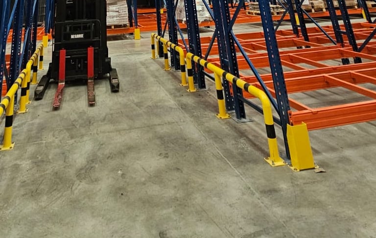 Protección total para las zonas de mayor tráfico. Estas barreras delimitan los pasillos y resguardan los extremos de las filas de racks (cabezales), donde los giros de los montacargas representan un riesgo constante de colisión.