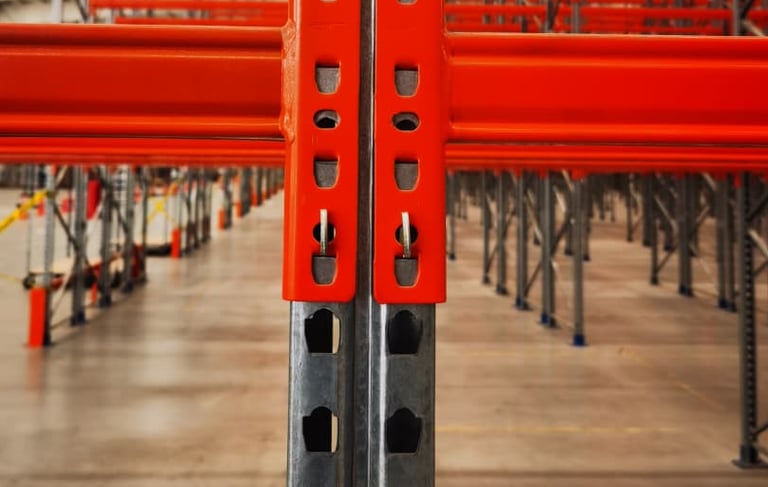 La precisión que tu almacén necesita. Los distanciadores aseguran que las baterías dobles de racks mantengan una separación uniforme y estable, garantizando que la estructura actúe como un solo cuerpo sólido.