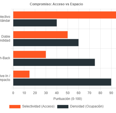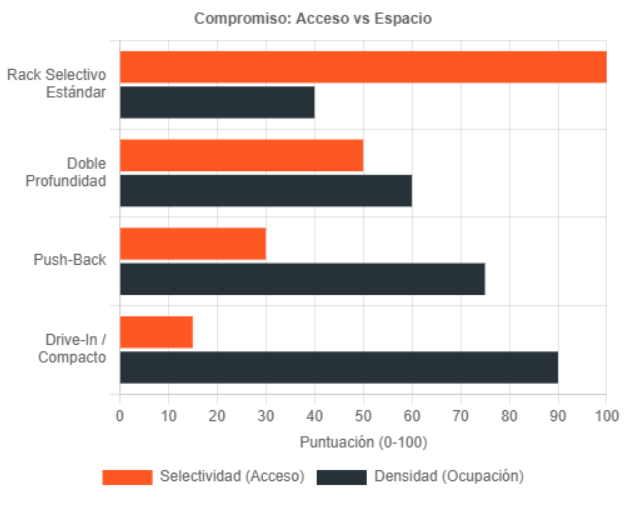 No existe el rack perfecto. A medida que aumentamos la densidad (capacidad de almacenamiento), perdemos selectividad (acceso directo a cada pallet).